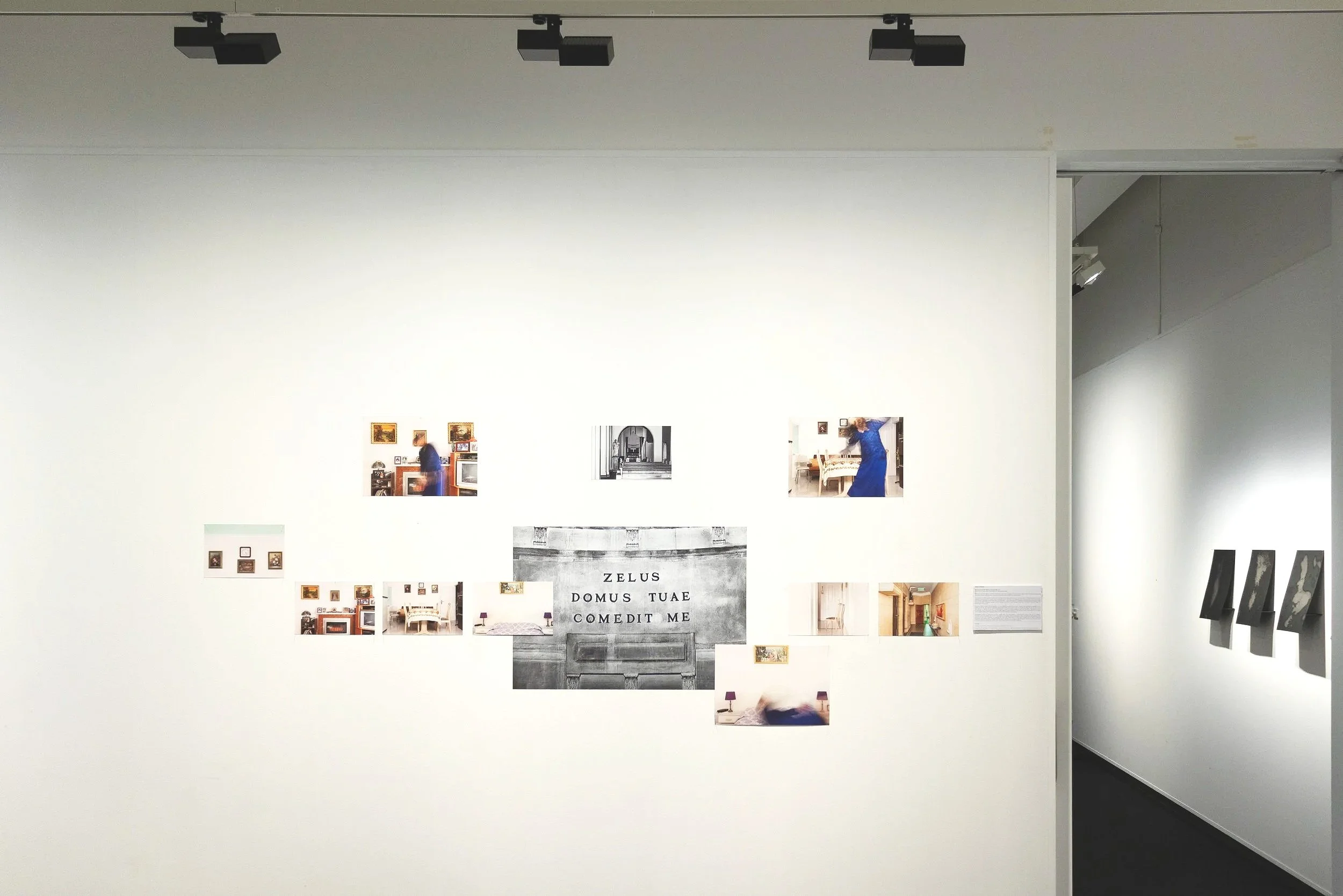 Memoria Comedit Me: Memory Consumes Me examines how re-entering spaces associated with my past identities can reconstruct fragmented memories of selfhood, allowing them to resurface through photographic practice and visual documentation. The process of immersing myself in spaces that I occupied while embodying ambiguous and transient states of identity revealed the pervasive presence that Christianity had throughout my formative years. By juxtaposing images of grandmother’s house and the church where I celebrated my First Communion and Confirmation, I examine the complexity of simultaneously embodying multiple undefined and often incompatible identities such as being both queer and Catholic. By pairing religious imagery with photographs of myself wearing my grandmother’s dress, I allude to the oppressive conservatism of the Catholic church and how it impacts queer people in both society and the family home. The phrase translating to ‘the zeal for your house consumes me’ is inscribed on the wall in St Mary’s church; centring this image aims to communicate the desire I felt to be accepted within my Catholic school community and family while growing up. While I am now comfortable within my identity, I still embody the liminal space of being baptised Catholic while disagreeing with heteropatriarchal ideologies of Christianity.